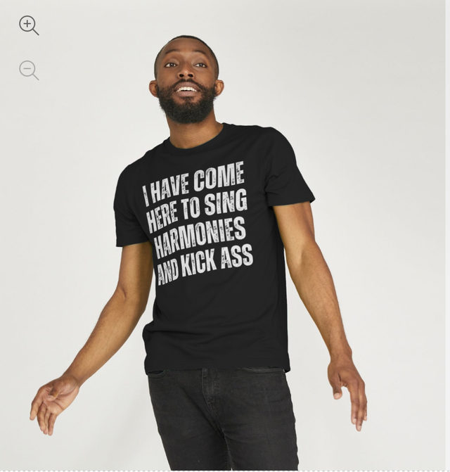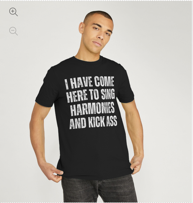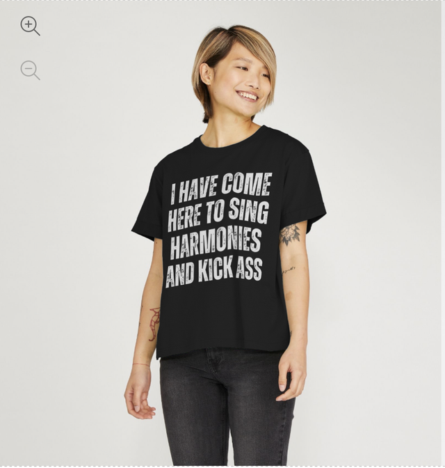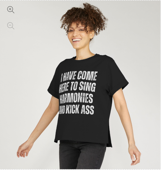 Front graphic reads: "I Have Come Here To Sing Harmonies And Kick Ass"